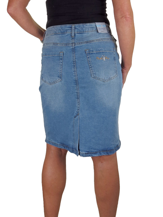Knee Length Stretch Denim Pencil Skirt Bleached Pale Blue