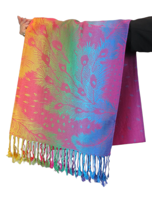 Rainbow Peacock Feather Pashmina Shawl Scarf Pink
