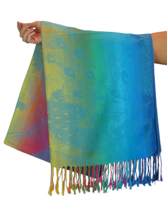 Rainbow Peacock Feather Pashmina Shawl Scarf Blue