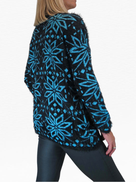 Women's Christmas Snowflake Fluffy Knit Jumper Turquoise Blue