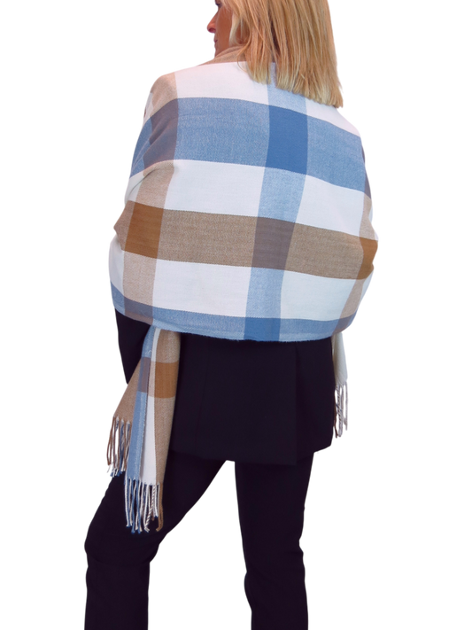 Wool Blend Large Plaid Design Wrap Scarf Beige/Blue