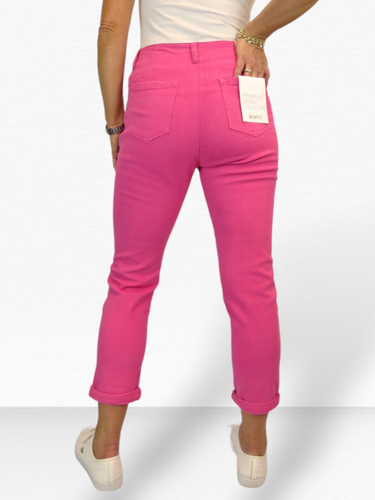 Slim Stretch Denim 3/4 Crops with Gold Button Detail Fuchsia Pink