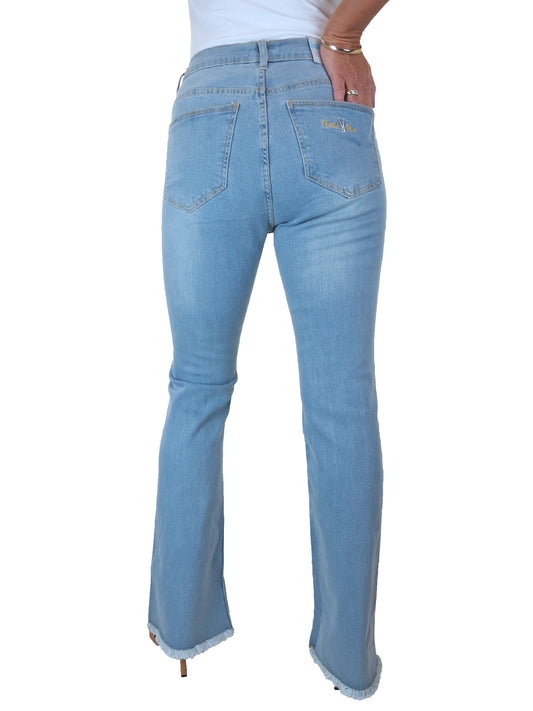 Women's Flared Stretch Denim High Waist Jeans With Frayed Hem Bleach Blue