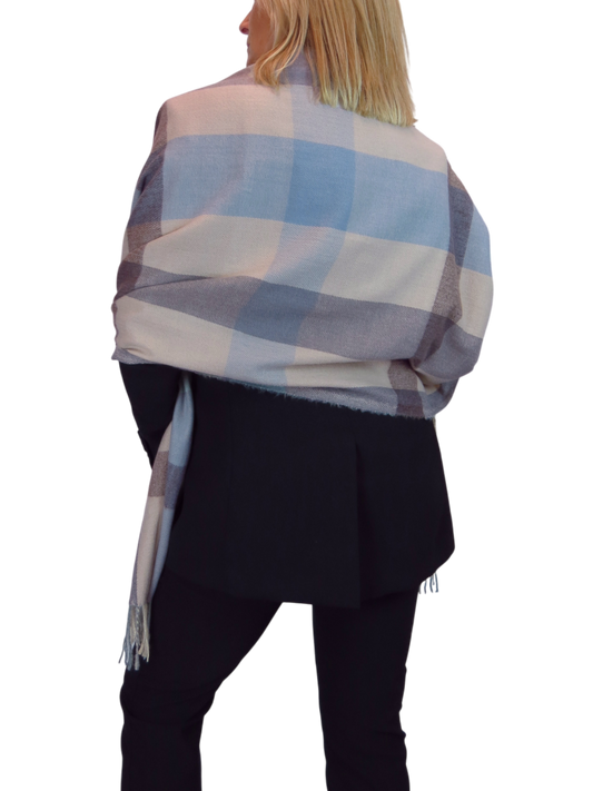 Wool Blend Large Plaid Design Wrap Scarf Beige/Blue