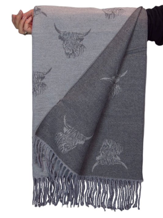 Highland Cow Cashmere Scarf Reversible Pashmina Shawl Grey