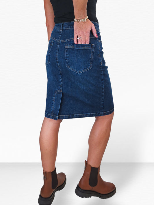 Stretch Denim Knee Length Pencil Skirt Dark Blue Faded