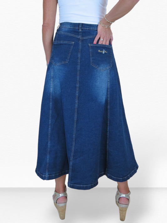 Stretch Denim Flared Maxi Skirt Dark Fade Blue