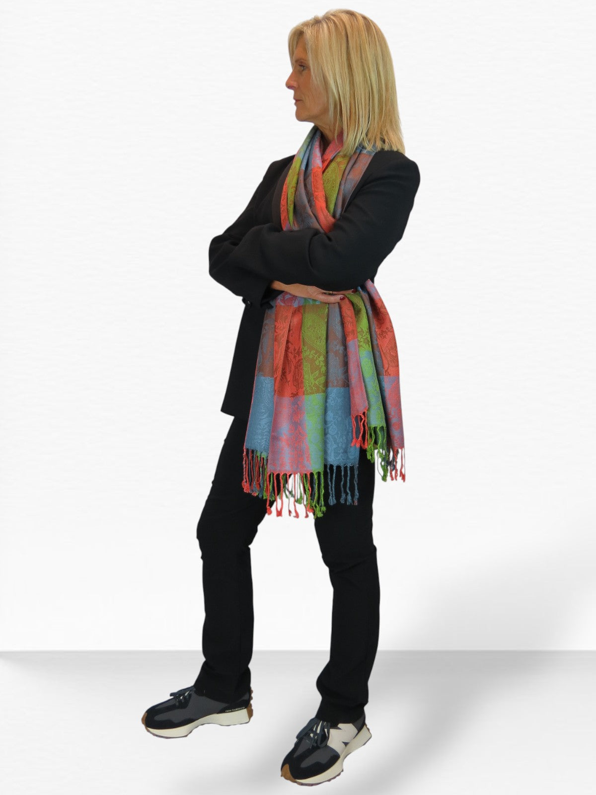 This beautifully soft pashmina-style wrap scarf features an all-over jacquard weave in a stylish colour-block square design. Woven from 100% viscose, it has a smooth, flowy drape with a gentle sheen - ideal for both everyday wear and evening occasions.