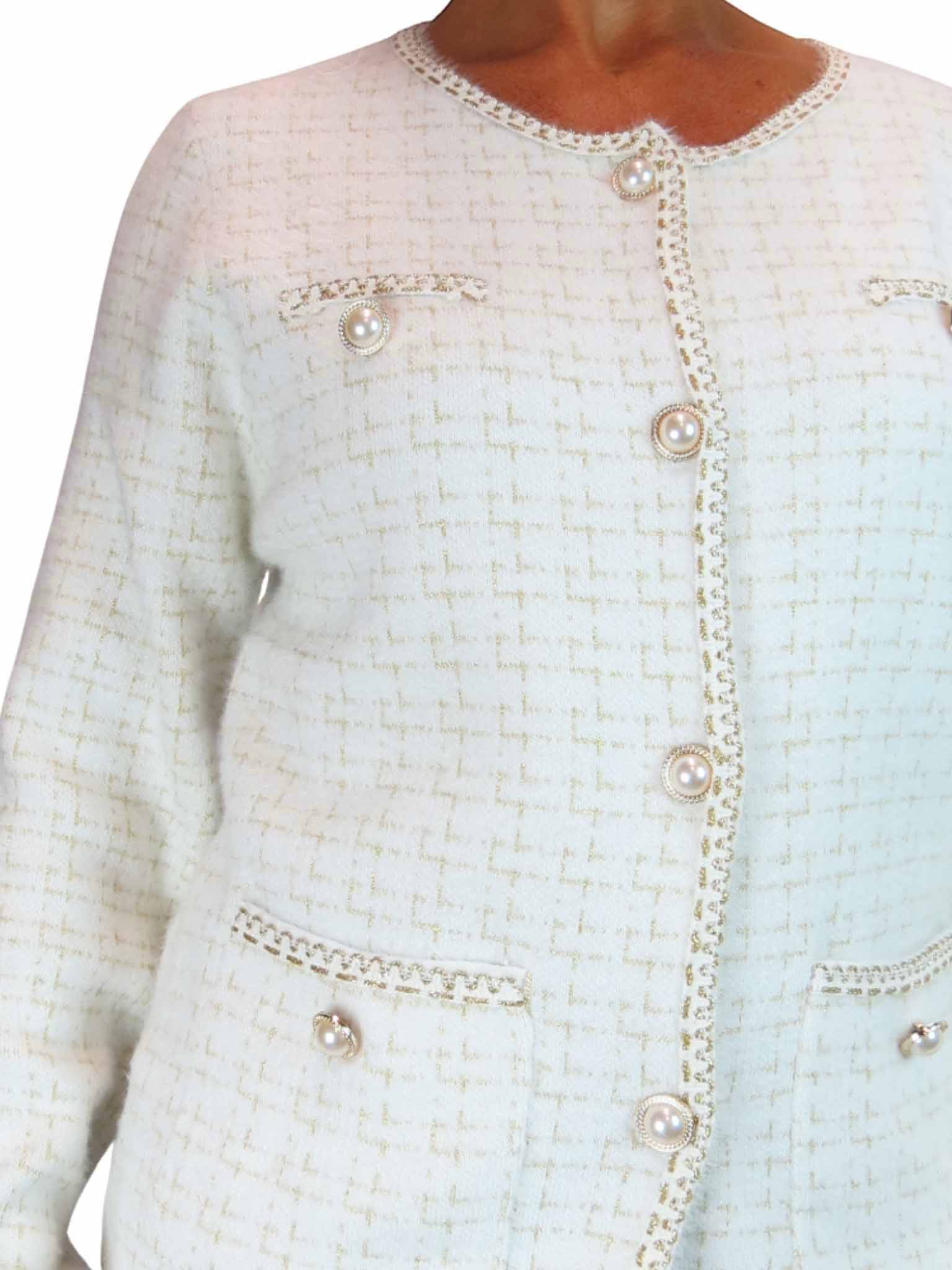 Chic Inspired Design: Classic tweed look with pearl-style buttons, golden edging and a subtle metallic fleck through the body and sleeves for a luxury finish.