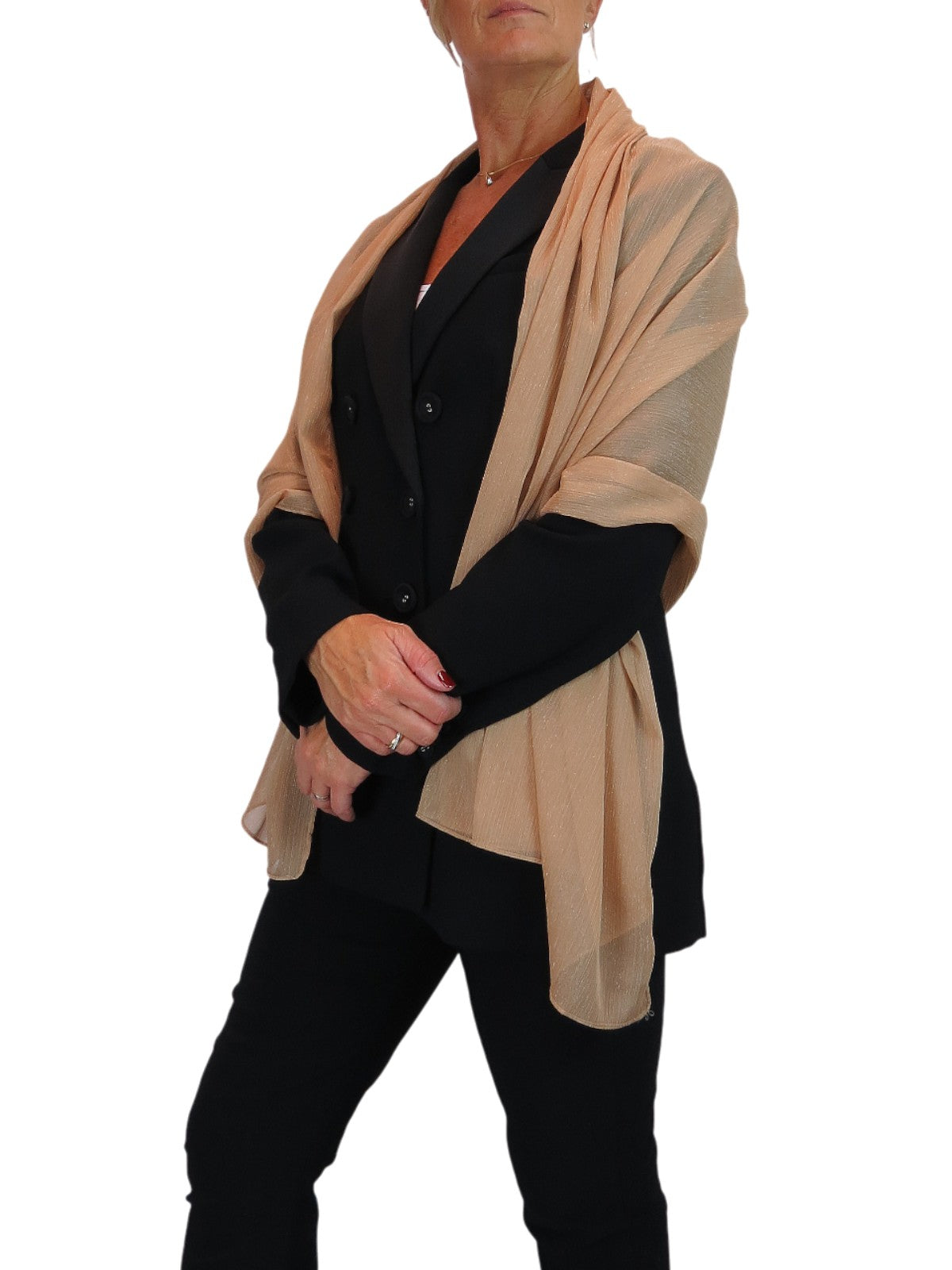 This oversized scarf is crafted from fine silk voile fabric and features Metallic Threads shimmer lines running throughout, offering subtle sparkle, luxurious texture, and effortless style. Lightweight and soft, it drapes beautifully over shoulders or around the neck, making it perfect for both casual and formal occasions.