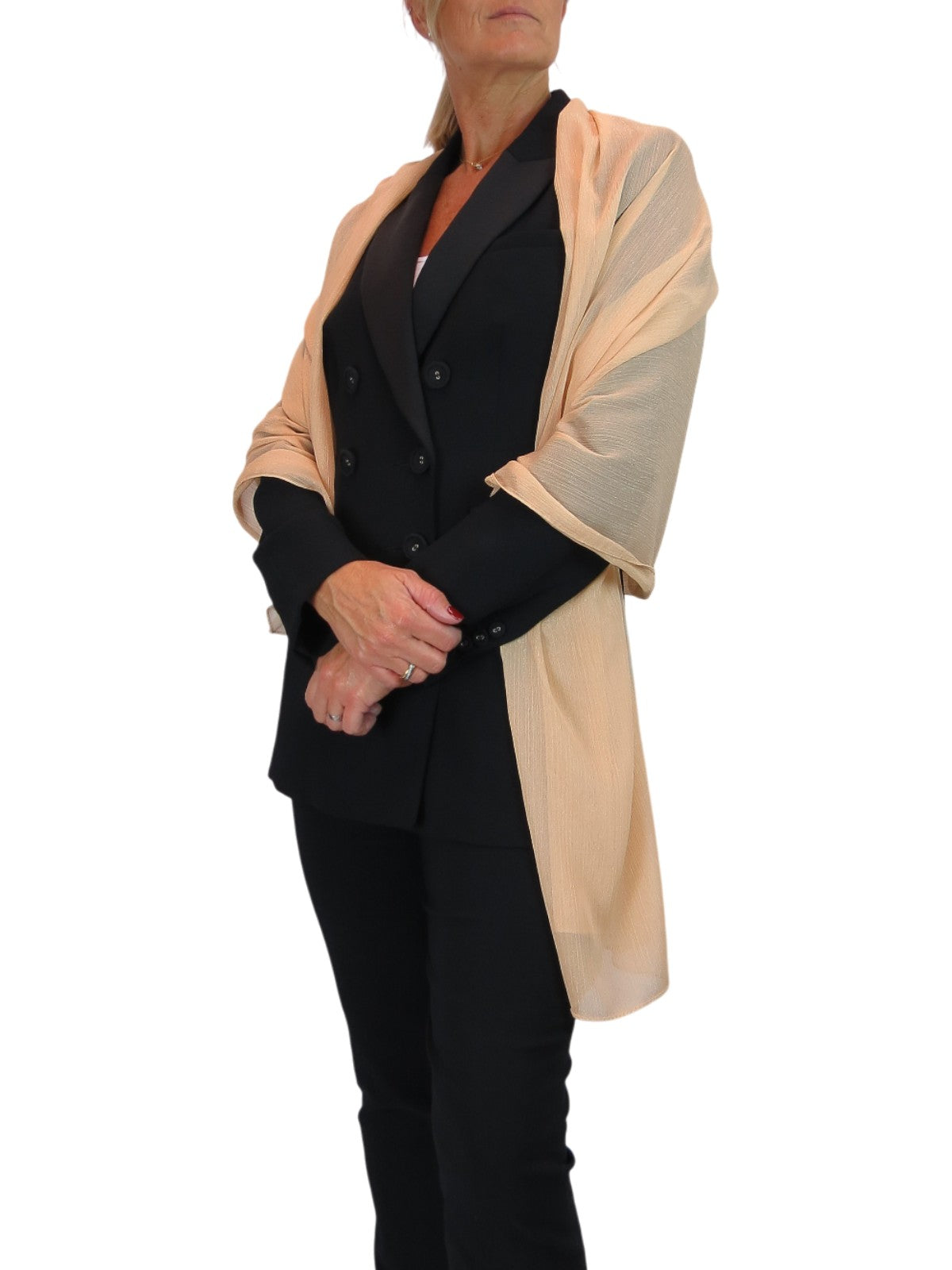 This oversized scarf is crafted from fine silk voile fabric and features Metallic Threads shimmer lines running throughout, offering subtle sparkle, luxurious texture, and effortless style. Lightweight and soft, it drapes beautifully over shoulders or around the neck, making it perfect for both casual and formal occasions.