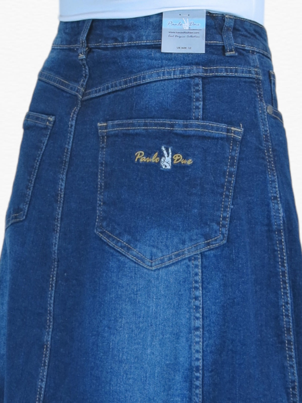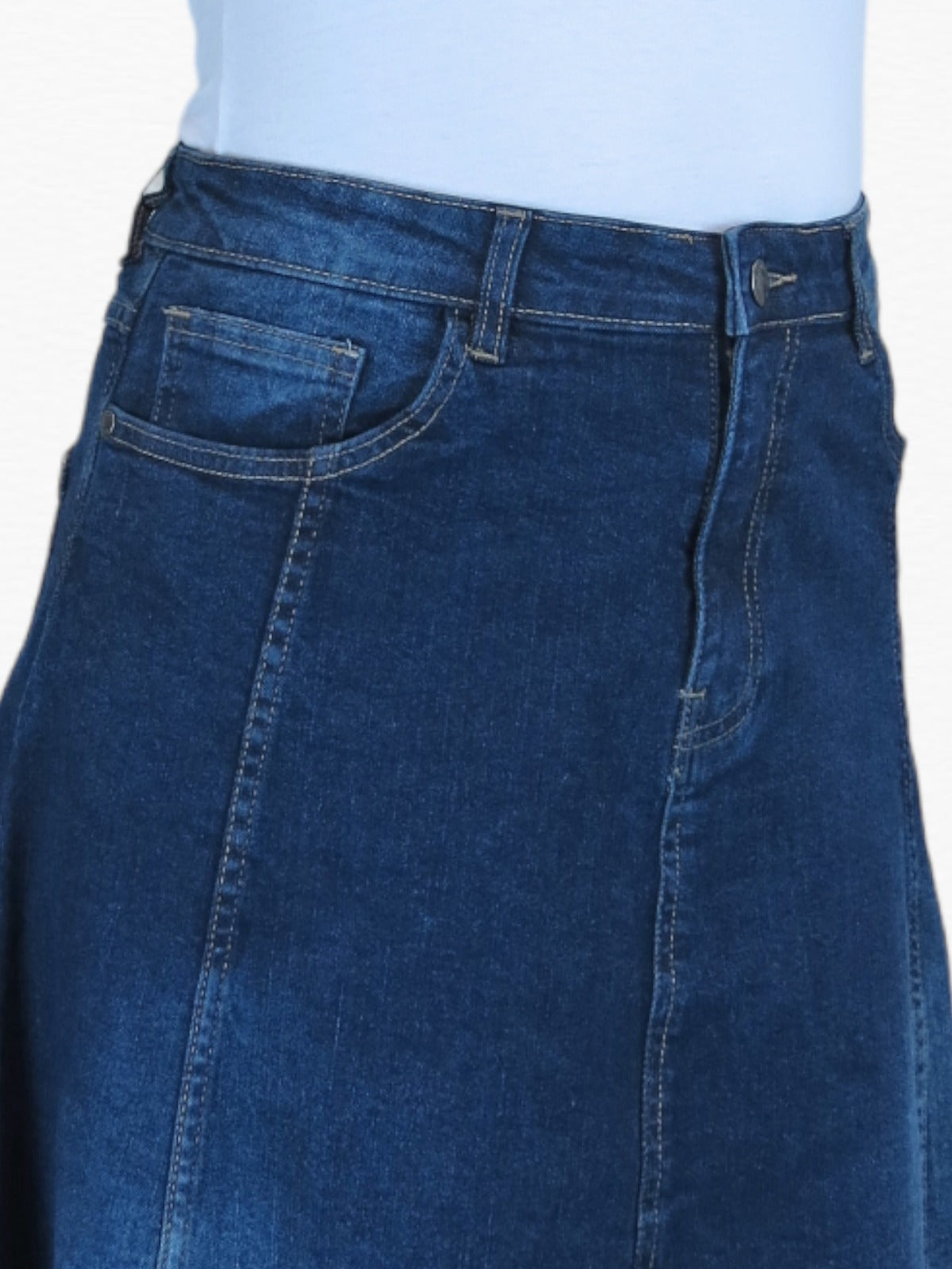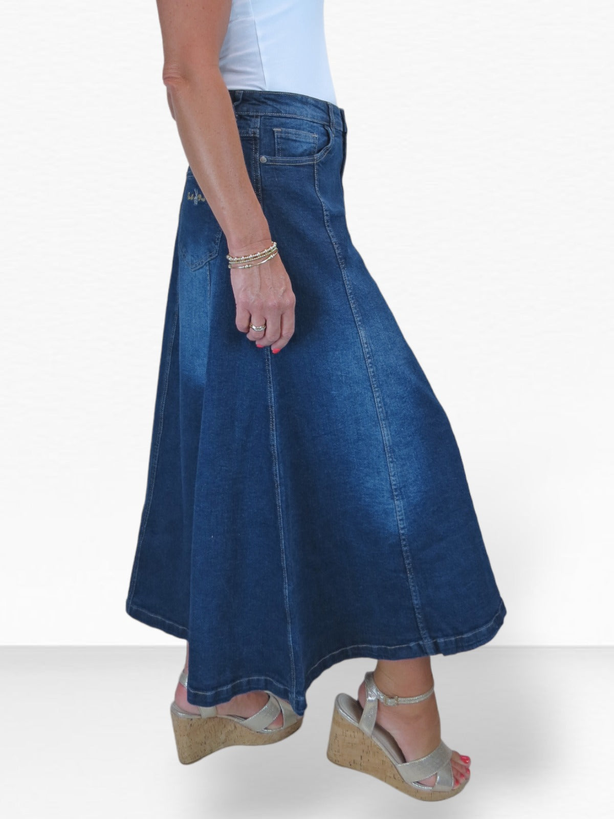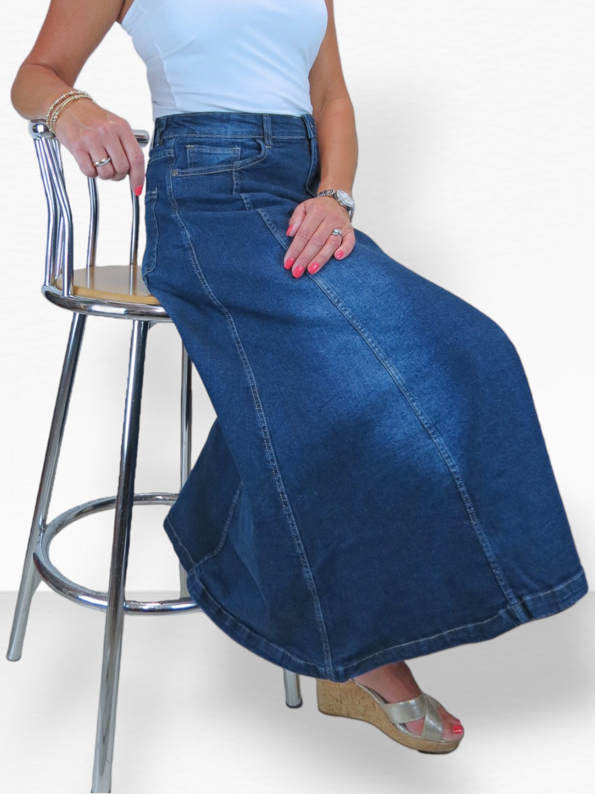 Stretch Denim Flared Maxi Skirt Dark Fade Blue