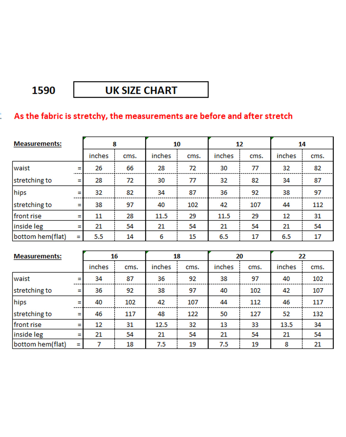 These ladies slim fit pedal pushers have an inseam length of 21" (54cms).