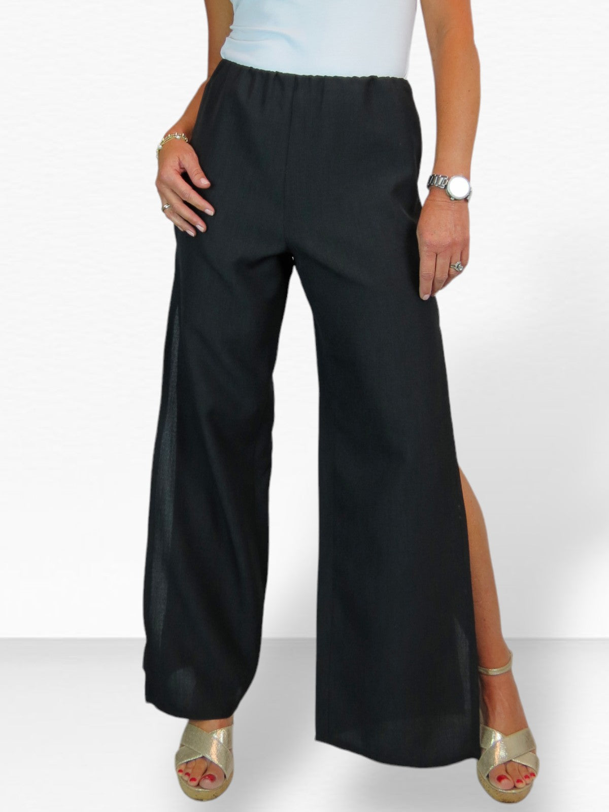 Crafted from a linen-look material, these trousers offer both style and comfort. The fully elasticated waistband ensures an easy fit, hidden discreetly within the waistband. With a wide leg and a 12" (31cms) split from the waist, they showcase your legs effortlessly.